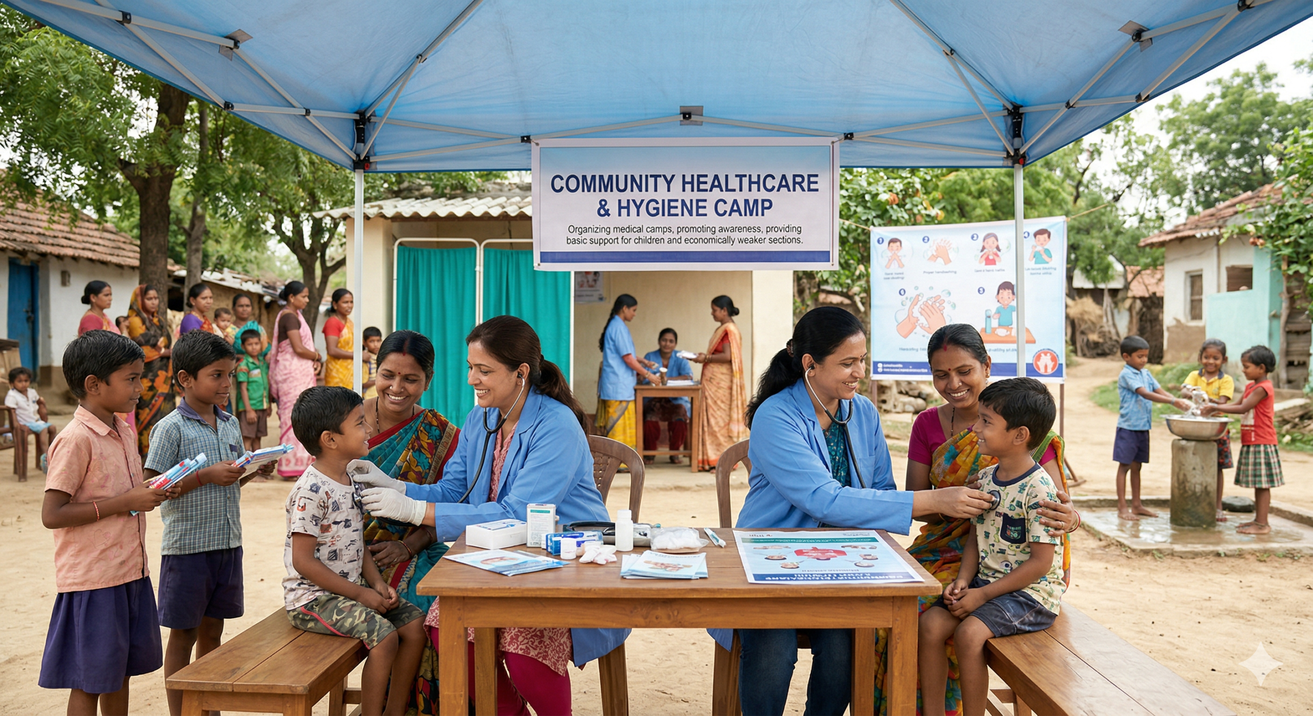 To improve community health by organizing medical camps, promoting hygiene awareness, and providing basic healthcare support to ensure a healthier lifestyle for children and economically weaker sections of society.